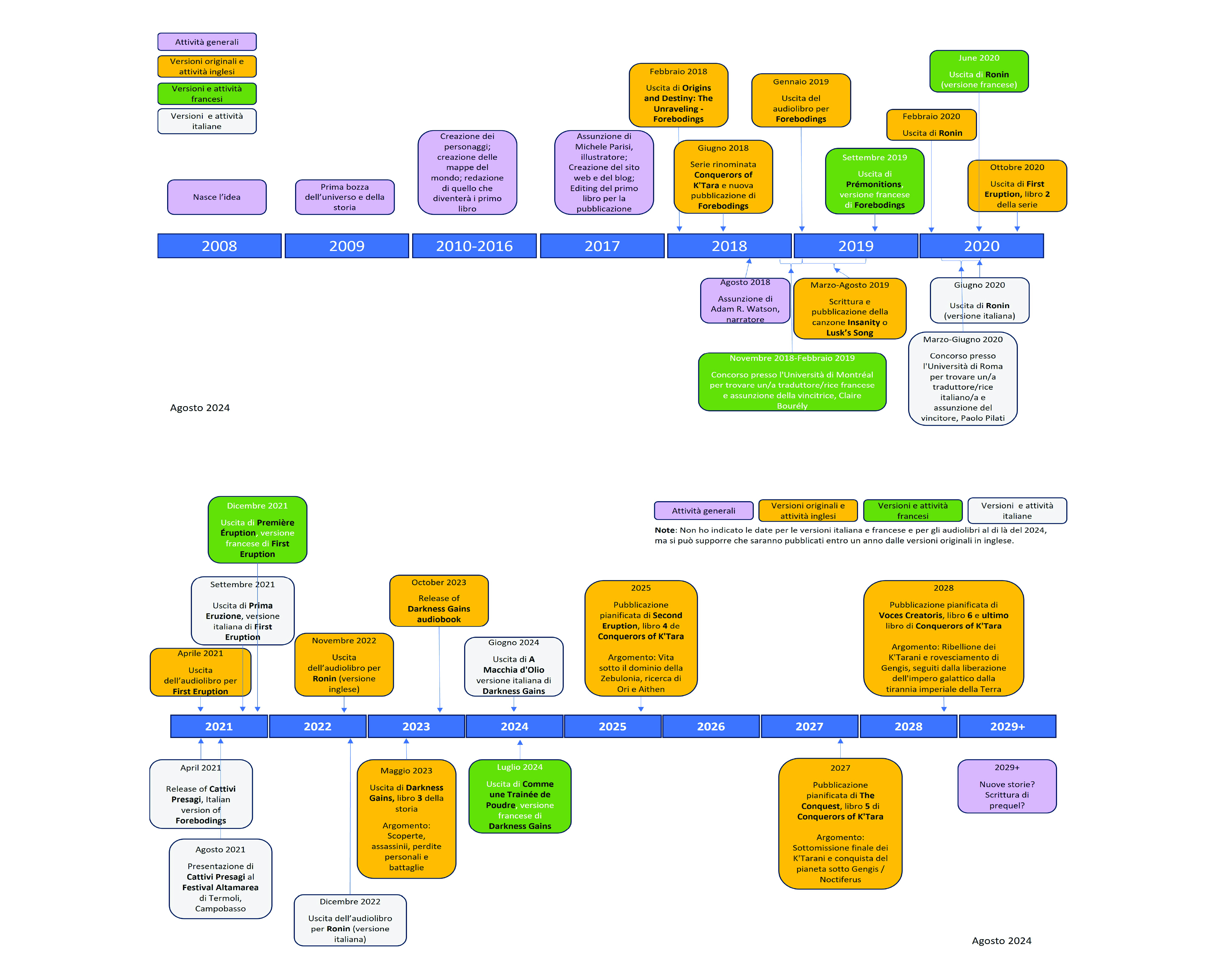 Le linee temporali sottostanti mostrano cosa ho fatto per arrivare fin qui, così come cosa ho intenzione di fare per concludere la serie, con date approssimative per le future uscite (e suggerimenti sugli argomenti di quei futuri libri).